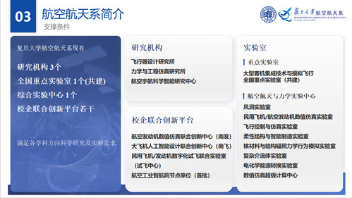 2.联合实验室:设有中国航发商发-复旦航空发动机数值仿真联合创新中心、上飞院-复旦大飞机人工智能设计联合创新中心、民用飞机/发动机数字化试飞联合实验室,深化产学研协同创新;